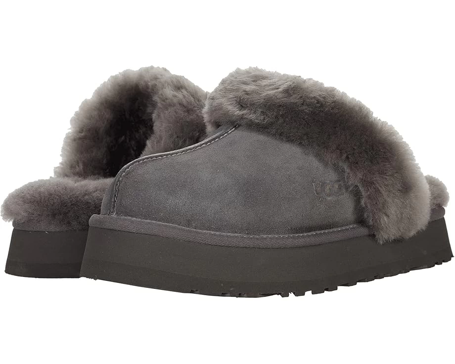 Elevate your comfort game with the UGG® Disquette slipper.SKU: #9524954Premium construction and materials.Secure and comfortable fit.Slip on mule style.Open back.Cushioned footbed.Fur lined.Real, dyed fur from sheep originating from United States, UK, Spain, Ireland, Australia.Suede leather upper.Sheepskin collar, lining, and footbed.Synthetic outsole.Imported.